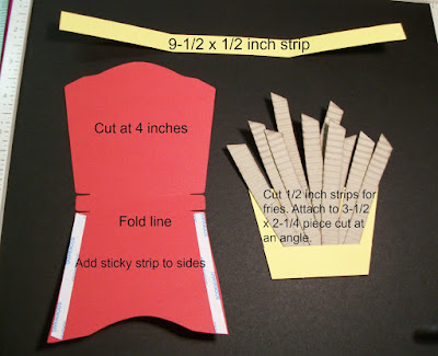 The yellow band acts as a cover-up for the fold lines on the box piece. I did add a top piece to the fries to cover the bottom portion and make it look more finished. This piece measured 2-1/2 x 3-4 inches. To make the fries, just cut 1/2 inch strips of an ivory or light tan cardstock and run it through your crimper or diagonal stripe embossing folder. If you don't have a diagonal stripe folder but have a straight stripe one, just put the strips in at an angle, or make lines on your scoring tool. I inked around the edges of the fry pieces to give them a little more dimension and life.